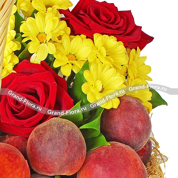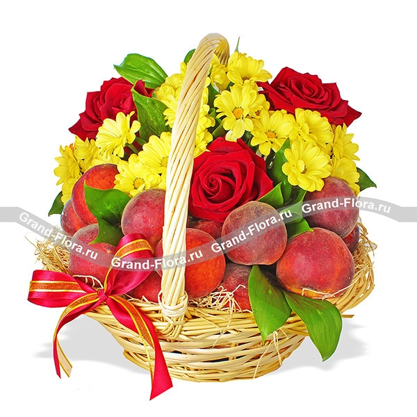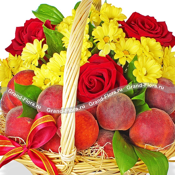 Стандартный (как на фото): роза красная - 3 шт., хризантема желтая кустовая - 2 шт., рускус - 2 шт., оазис, корзина средняя, бант красный, персики - 1,5 кг.